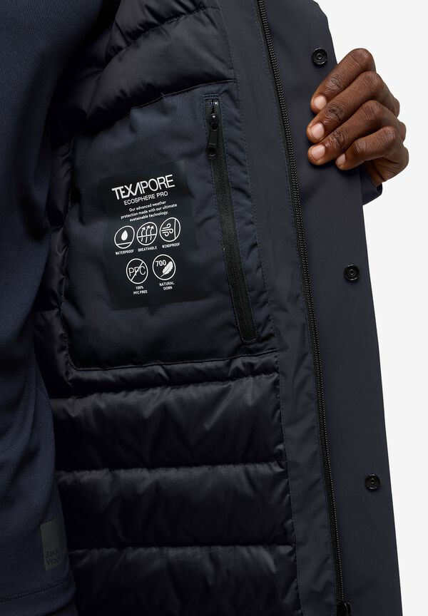 Der BRANDENBURGER COAT, dein wärmster Parka, bringt einen stylischen, urban-inspirierten Touch in deinen Alltag. Dieser lange, schützende und ultra-warme Mantel besteht aus TEXAPORE ECOSPHERE PRO Material für erstklassigen wasserdichten Schutz sowie einer 700er RDS Daunenfüllung für kuschelige Wärme. Zu den stilvollen Details gehören eine diskrete Brusttasche und 2 Hüfttaschen sowie ein Formsaum und eine fest mit der Jacke verbundene, verstellbare Kapuze.